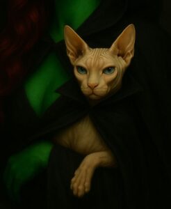 When the Countess clawed her way into eternity, something followed her from the firelight of the crypt. Born of midnight purrs and candlelit whispers, Lucipurr slunk into her lap and never left. His turquoise eyes gleam with unholy secrets, his velvet cape brushing against gravestones as if to remind the world that even death deserves a pet. Loyal only to the Countess, he is her watchful sentinel, her silent assassin, her whispering devil curled at the foot of her coffin. Where she walks, he prowls; where she feeds, he feasts.